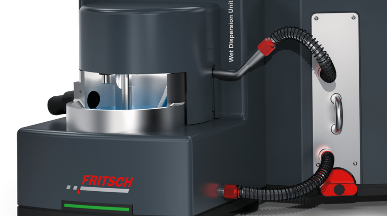 During a wet dispersion the sample material is added to a closed liquid circuit and continuously pumped through the measurement cell. During the pumping process in the measuring circuit, ultrasound can be added in order to break up the agglomerates and obtaining single and separated particles. Unproblematic samples that submerse directly in water without significant effort and do not have large fines, are added to the dispersing unit of the ANALYSETTE 22 as a solid, portion by portion, using a spatula and can be measured reproducibly after a brief ultrasound exposure / dispersion (30 - 60 s). Prior to a measurement, especially for strongly bonded agglomerates, a treatment of the sample, with ultrasound is often helpful. For the wet dispersion, if possible should the selected liquid wet the material spontaneously and completely.